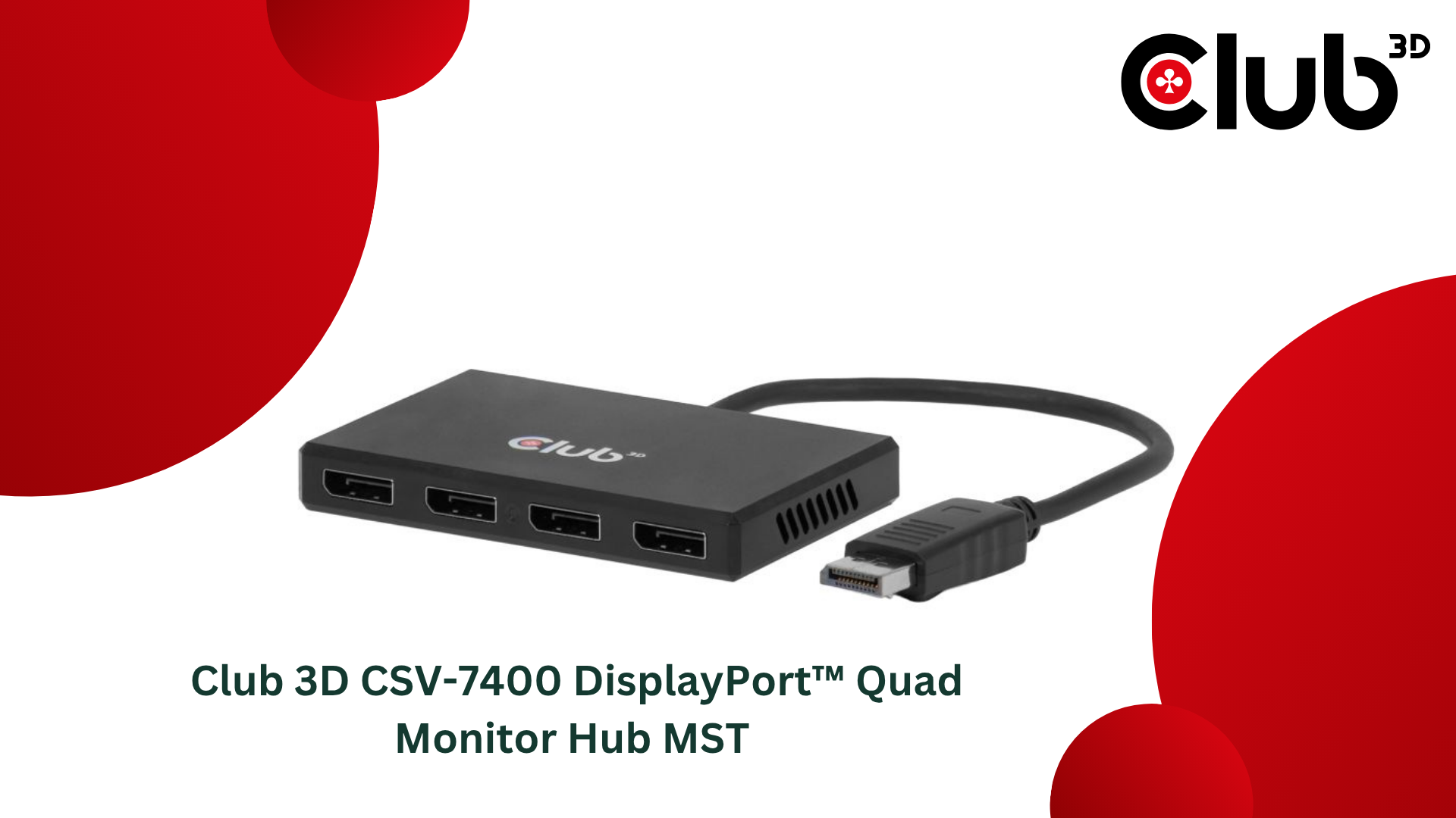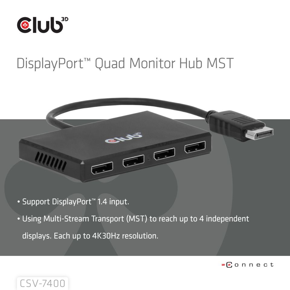 A Club 3D – egy holland technológiai innovátor, amely 1997 óta foglalkozik fejlett számítógépes csatlakozási megoldásokkal – bemutatta a legújabb MST-képes, akár 4 monitort is támogató CSV-7400 DisplayPort™ hubját.